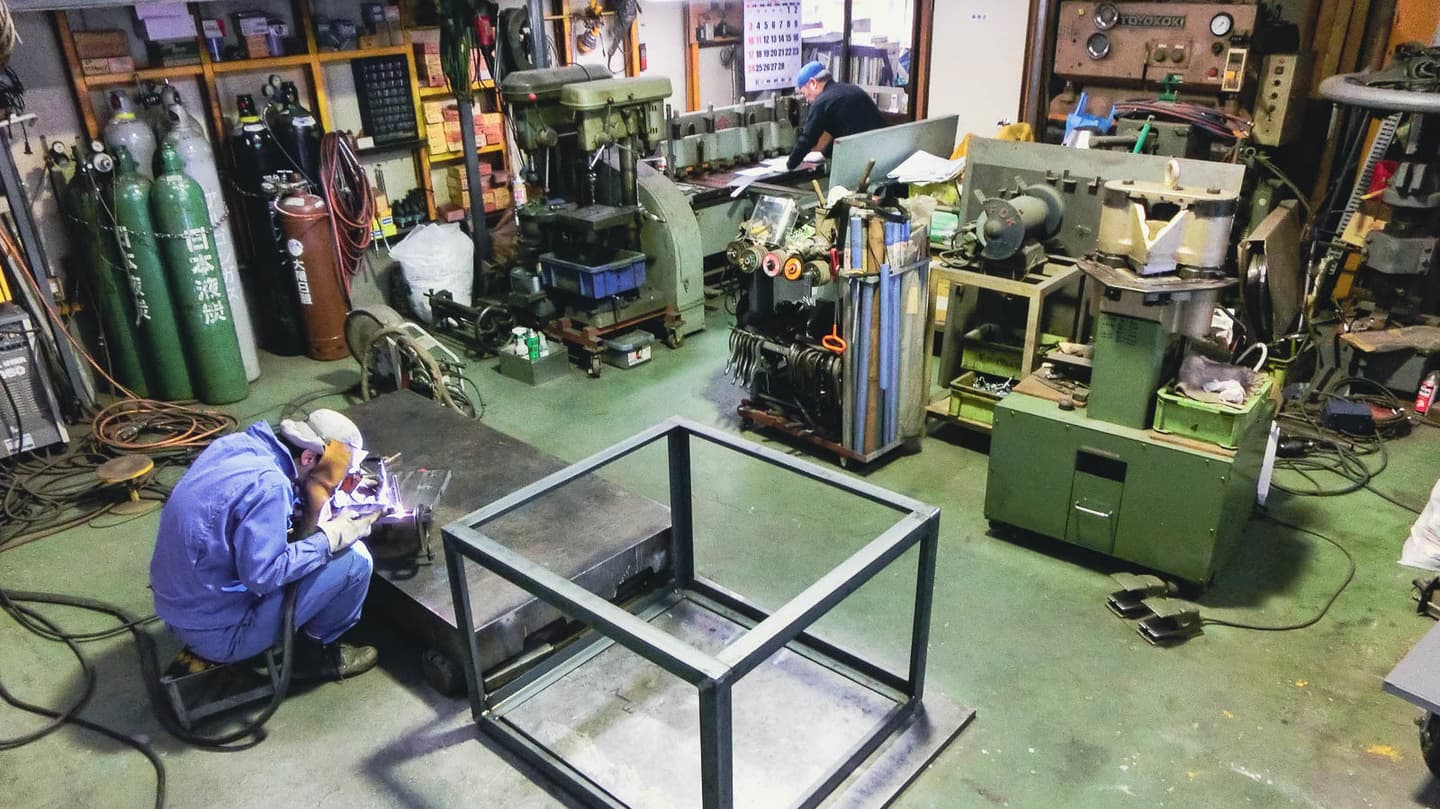 カシマウェルディングの溶接作業スペースは奥行き約9.2m、横幅約5.5m、高さ約3.5mとなっております。簡易塗装ブースやシャーリングマシン等も保有しているため、溶接以外の多様なご要望にも迅速に対応する事が可能となっております。出張溶接にもご対応。まずはご相談ください、