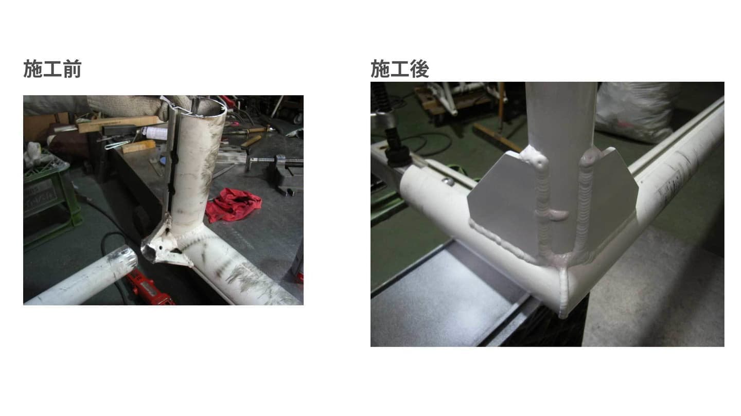 左画像は車いすテニス界で活躍されるお客様から、チタン素材を用いた車体の改造のご相談を頂き、弊社で施行したものです。「現在の車体で使用しているシートを新しい車体に乗せて欲しい」とのご依頼を頂きました。このケースの場合、パイプ同士の溶接だと接地面に不安を残したので、溶接面を増やす為、丸棒を用い、接地面を確保致しました。